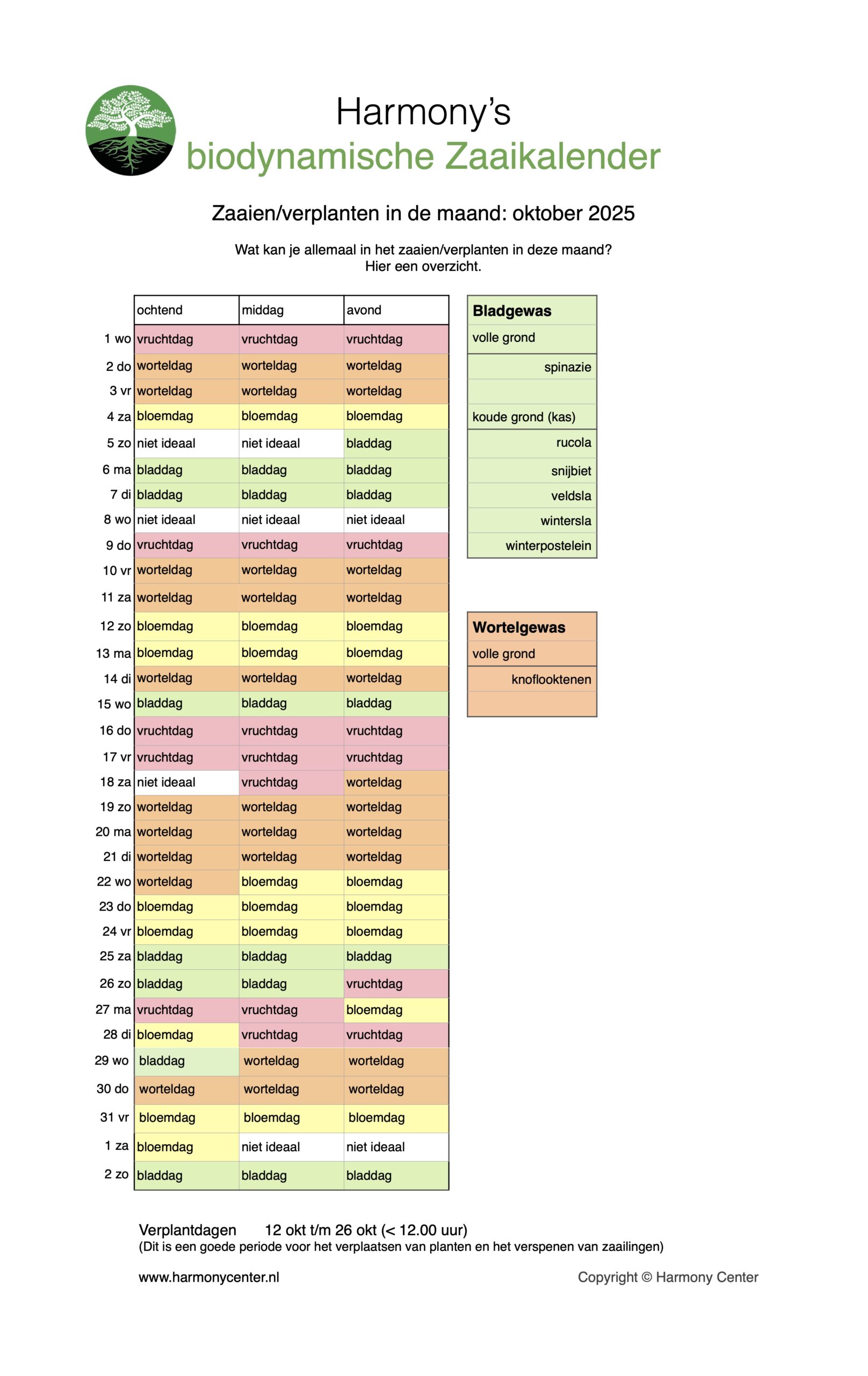 Hieronder vind je mijn actuele biodynamische zaaikalender van deze maand en alvast die van volgende maand. Voor meer informatie over de achtergrond van deze kalender en de wijze waarop ik er mee werk, zie mijn artikel “werken met de biodynamische zaaikalender“.