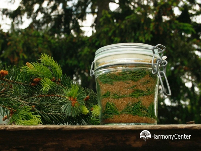 - Pluk voorzichtig licht groene Dennen- of Sparrentoppen.