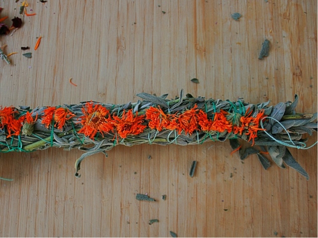 Zo heb ik bij deze smudge sticks gebruik gemaakt van kruiden die ik in de tuin heb staan: salie, rozemarijn, lavendel, tijm, goudsbloemen en rozenblaadjes.