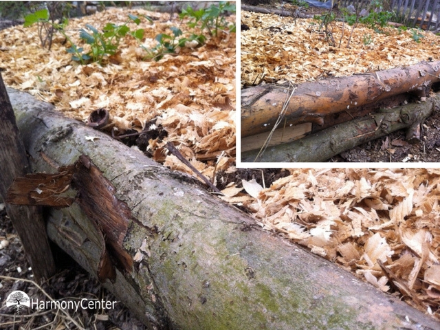 Ook deze bedden heb ik gelaagd opgebouwd, met als basis een mengeling van oude (soms al rottende) en nieuwe boomstammen, kleinere takken, paardenmest, hooi, bladeren, compost, houtsnippers, en een bovenlaag aarde.