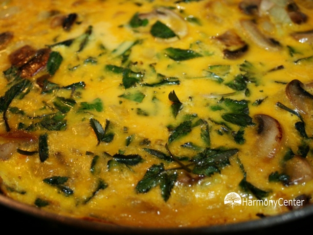 - Schenk het eiermengsel in de pan bij de champignons en uien en bak het op middelhoog vuur tot de omelet lichtjes gestold is.